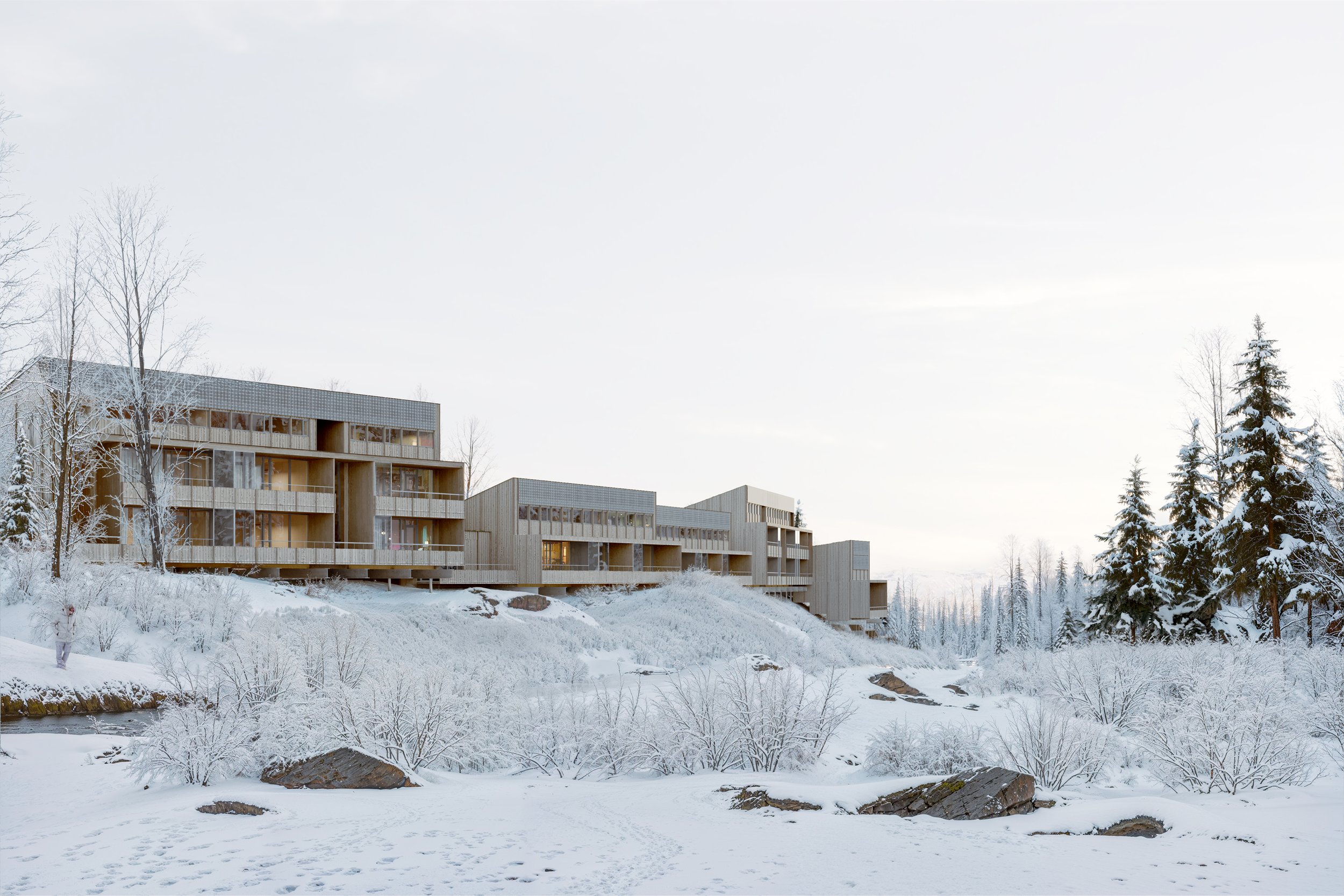 A climate-driven, minimal-impact approach allows buildings to step with the natural topography, minimising rock blasting and preserving the terrain. Studies of wind, sun, and microclimate inform building placement and orientation, creating sheltered outdoor spaces and improving comfort throughout the year.