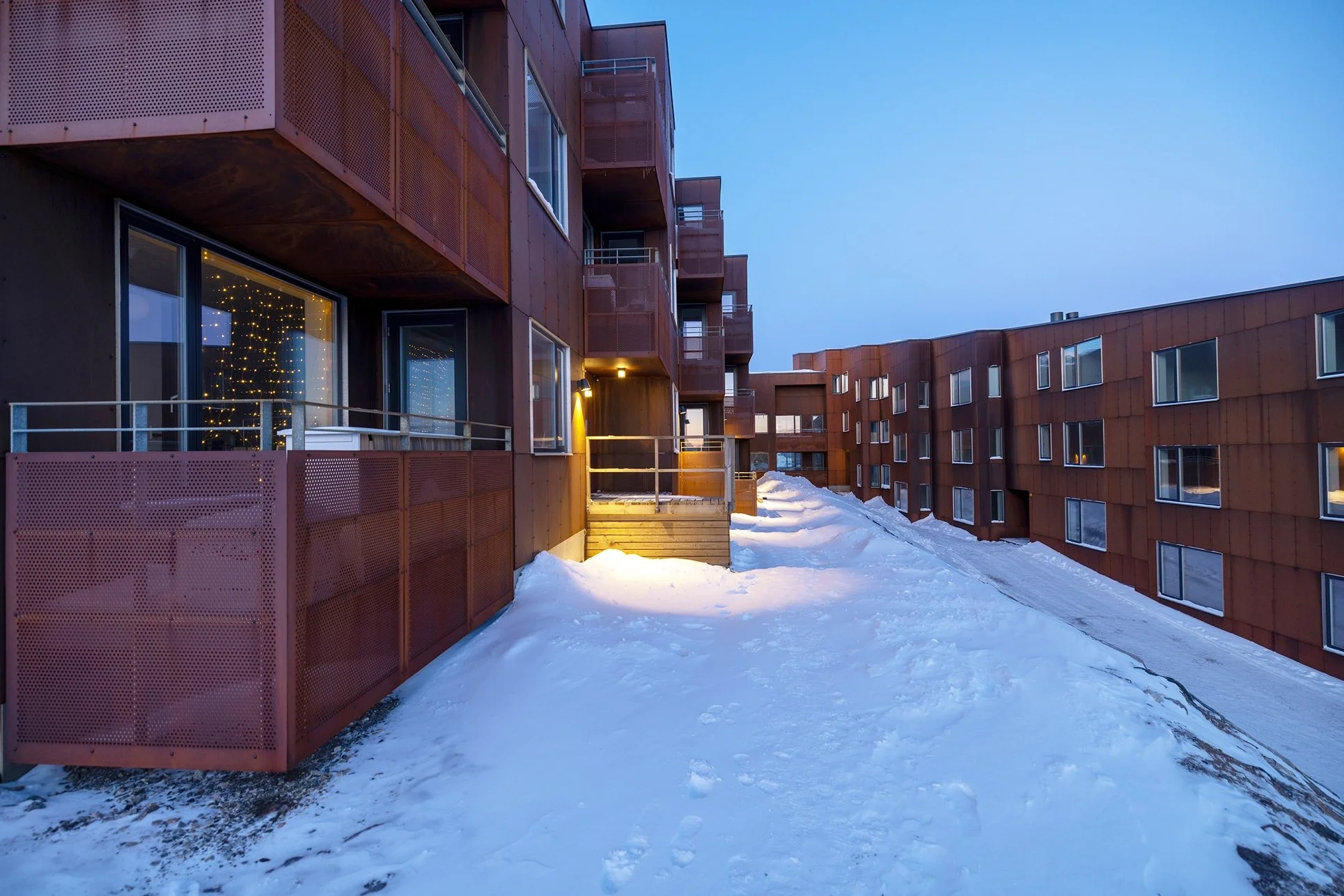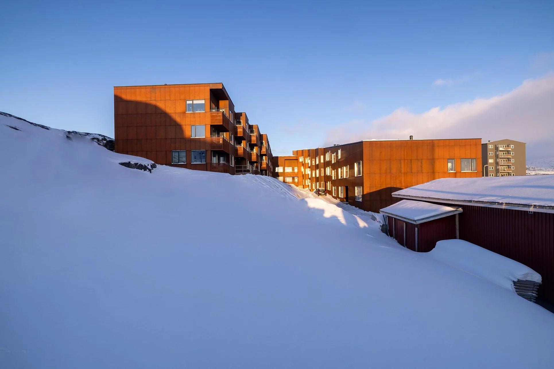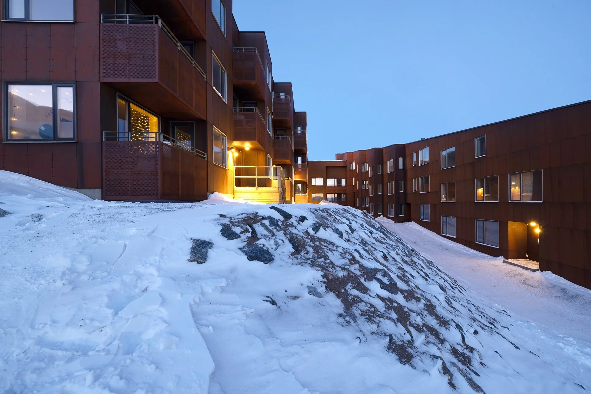 Nuukullak 10 is positioned along a mountain ridge in central Nuuk, responding to the challenge of building on a steep, wind-exposed site in a Low Arctic climate. Shaped as a horseshoe, the low-rise residential building encloses a wind-sheltered courtyard that establishes a protected microclimate while opening southward to daylight, views of the surrounding landscape, and the sea.